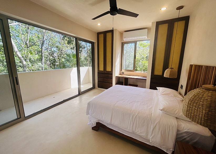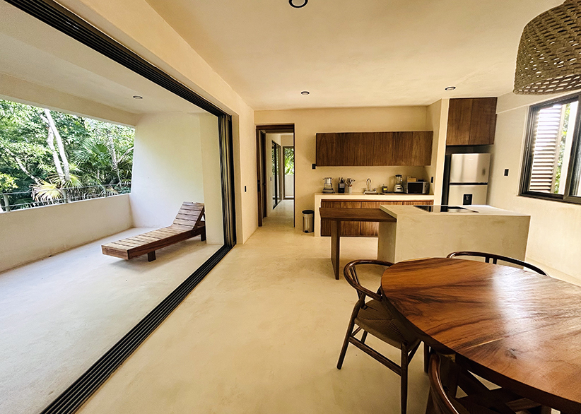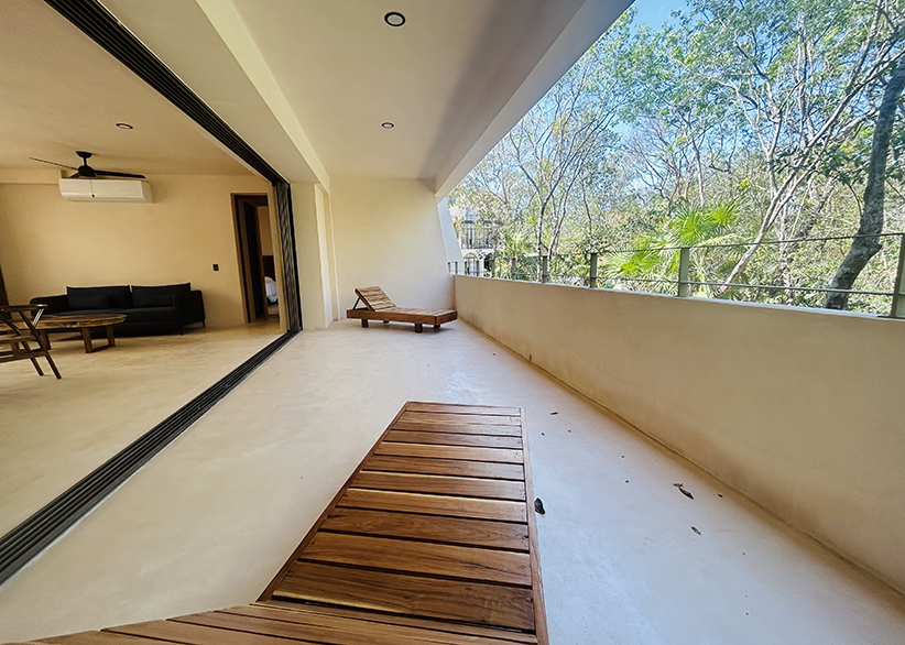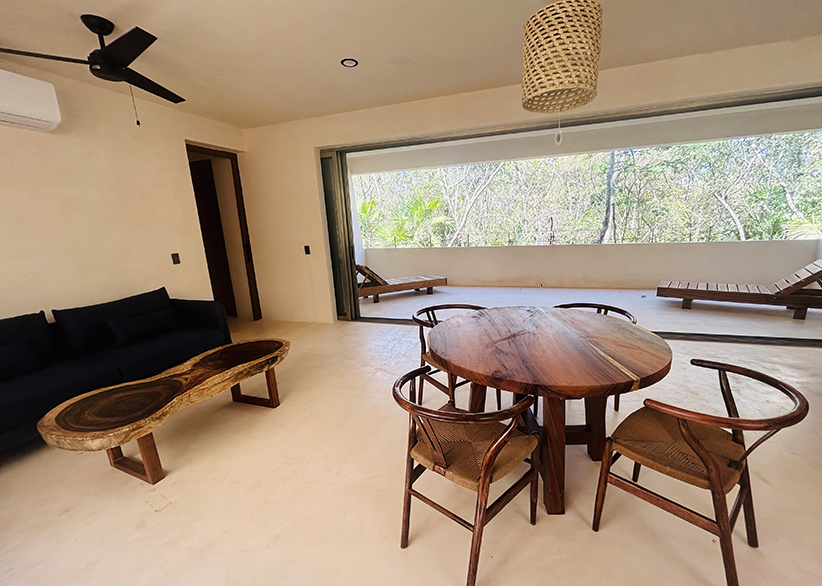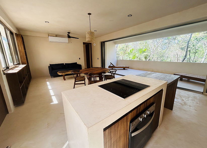 The Aire Apartment features 2 spacious bedrooms, 2 full bathrooms, an open kitchen with island, and living-dining areas with floor-to-ceiling windows that fully open, connecting to a stunning 40 m² terrace surrounded by lush vegetation. Its interiors offer a warm and bright atmosphere. It is delivered fully furnished and equipped, ready to live in or rent.
