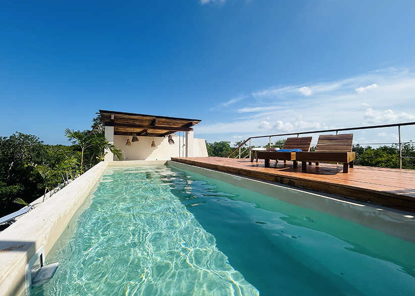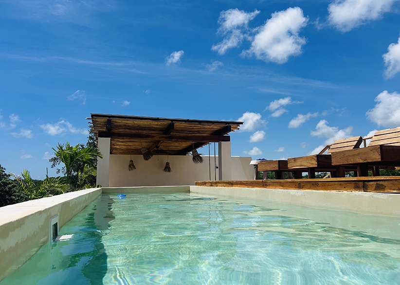 Residents also enjoy a shared rooftop with swimming pool, lounge area, BBQ, and beautiful jungle views.